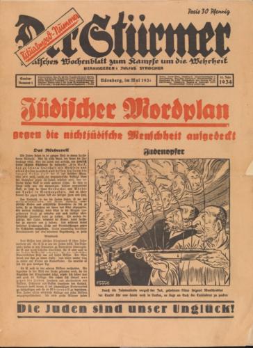 „Der Stürmer”, wydawany od 1923 roku przez fanatycznego antysemitę Juliusa Streichera, był najprymitywniejszą i najbardziej brutalną gazetą propagandową nazistowskich Niemiec. Jej przekaz opierał się na otwartej, wulgarnej nienawiści, a język celowo przypominał uliczny krzyk, nie elegancką publicystykę. Publikowane w niej treści były pełne radykalnej agresji, a Żydzi przedstawiani byli w jednoznacznie odczłowieczający sposób- jako szczury, choroba, zagrożenie biologiczne. Niektóre rysunki i karykatury miały cel szokować, obrzydzać, wzbudzać wstręt, a nie przekonywać logicznie. Gazetę kolportowano publicznie, na ulicach i w specjalnych gablotach „Stürmerkasten”, tak aby każdy Niemiec- nawet ten, który nie kupował prasy- musiał się z nią zetknąć. Streicher nie próbował prowadzić dyskusji- zadaniem „Der Stürmer” było podsycać emocje, budować nienawiść jako normę i moralnie usprawiedliwiać przyszłą eksterminację Żydów.