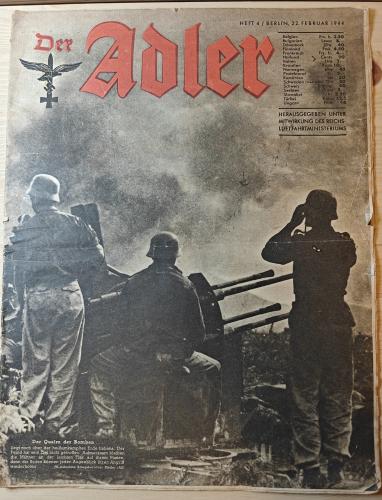 „Der Adler” był oficjalnym magazynem Luftwaffe, wydawanym od 1939 roku jako prestiżowe, ilustrowane czasopismo propagandowe. Od samego początku wyróżniał się wysoką jakością druku, nowoczesnym układem graficznym i dynamicznymi fotografiami lotniczymi, które miały budzić podziw dla potęgi technicznej i nowoczesności niemieckiego lotnictwa. W odróżnieniu od brutalnej propagandy nienawiści, „Der Adler” przedstawiał wojnę niemal romantycznie- jako heroiczne starcie pilotów, mistrzostwo techniki, triumf odwagi i inteligencji. Piloci Luftwaffe ukazywani byli jako arystokracja pola bitwy, elita wojskowa- spokojna, opanowana, pewna siebie. Zamiast grozy wojny, gazeta eksponowała piękno maszyn, spektakularne ujęcia w powietrzu, precyzję ataku, a nawet estetyczną elegancję munduru i braterstwa lotniczego. Co istotne- „Der Adler” był także wydawany w wersjach obcojęzycznych (m.in. po angielsku, francusku, hiszpańsku). Nie był to więc przekaz zastraszający, lecz propaganda prestiżowa- mająca robić wrażenie na zagranicy, tworzyć wizerunek Niemiec jako państwa niezwykle rozwiniętego technologicznie i cywilizacyjnie.